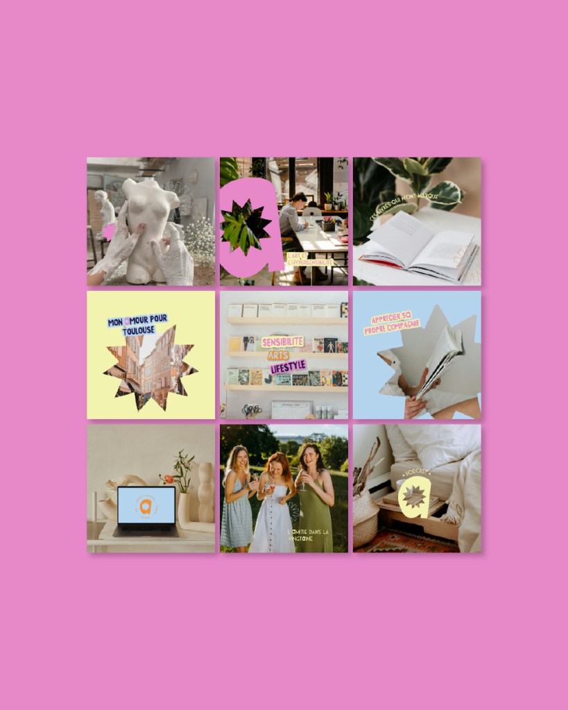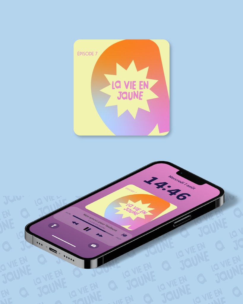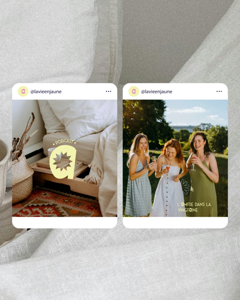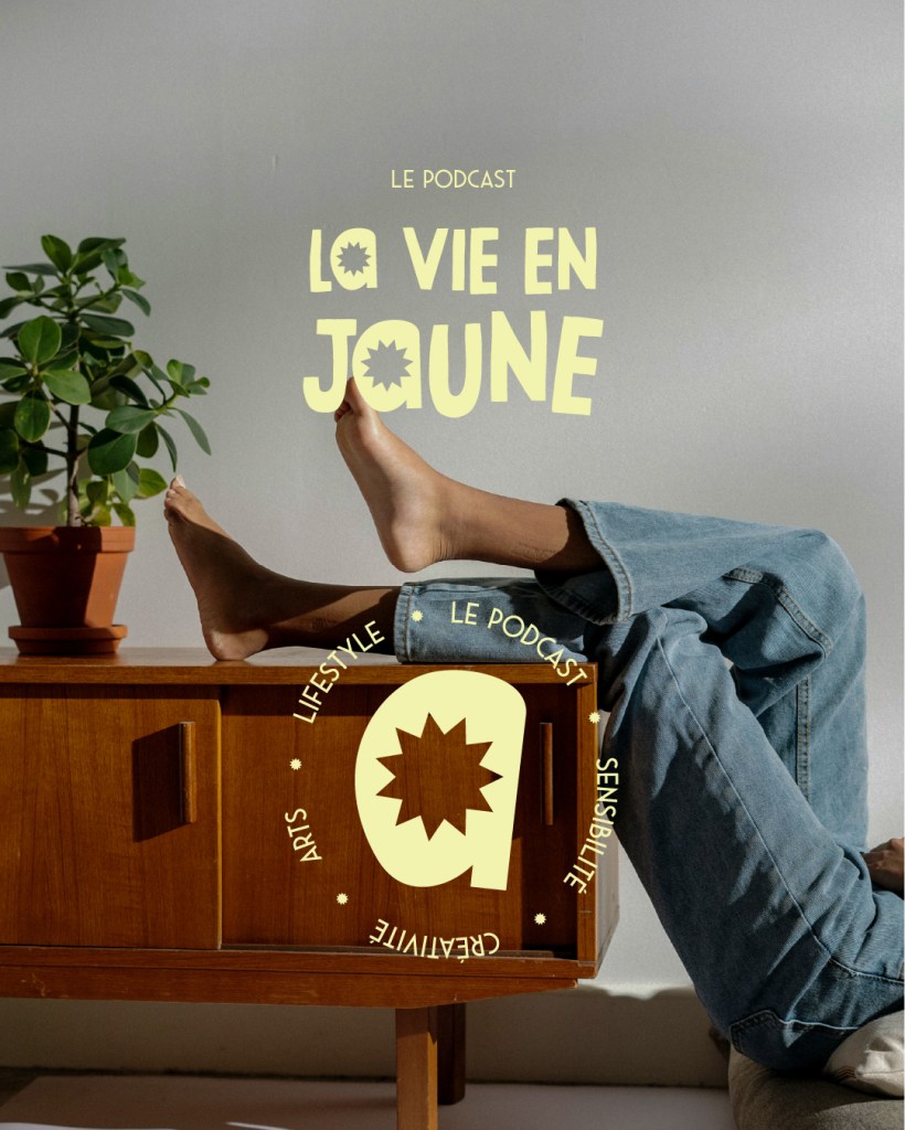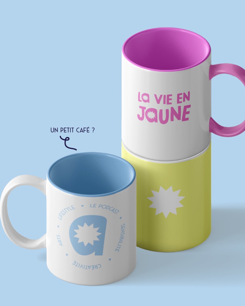 Sur les supports digitaux : Que ce soit à travers les couvertures d’épisodes, les posts Instagram ou les objets dérivés comme des mugs, l’identité graphique de « La Vie en Jaune » s’invite partout. L’objectif est clair : créer une atmosphère qui invite à sourire, à réfléchir et à savourer ces instants simples mais précieux.